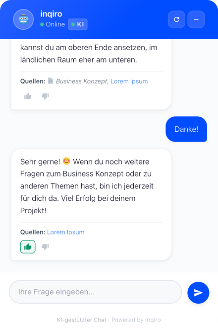 inqiro ändert das. Der Chatbot kennt jede Seite, jeden Beitrag und jedes Produkt auf Ihrer Website – und gibt Ihren Besuchern sofort die richtige Antwort.
